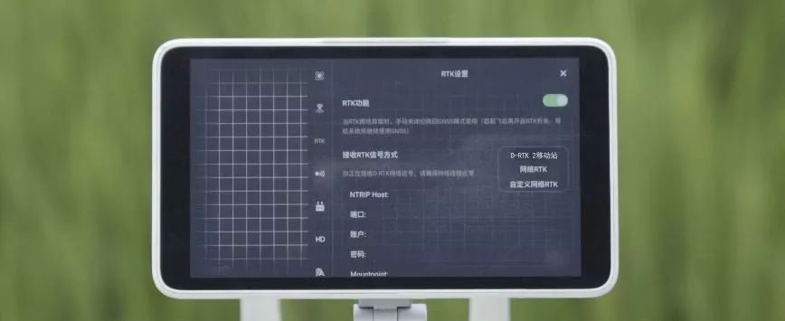 查看遥控器作业界面,状态栏显示“ RTK ”符号及卫星数,当图标变为白色时, RTK 初始化成功。基站会根据当前收星状态自动获取定位信息。
