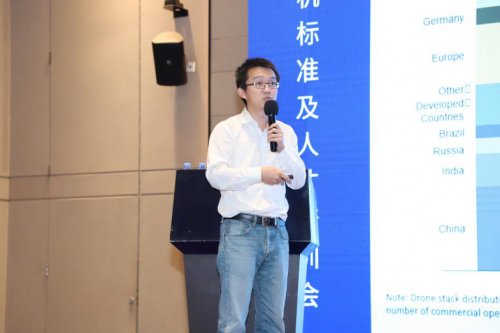 在企业分享环节,来自深圳市大疆创新科技有限公司的王垚在现场分享大疆创新标准化战略,阐述了大疆无人机的战略方向,并对无人机标准建设提出了殷切的期望。来自小米通讯技术有限公司的代表洪伟,从国际化视角介绍了无人机身份识别国际标准化进展。京东无人机事业部代表史睿从物流无人机发展角度,回顾和总结了京东物流无人机标准的建设的心得和体会。最后由华为技术有限公司企业代表李刚,分享了通信技术支持无人机应用与管控。