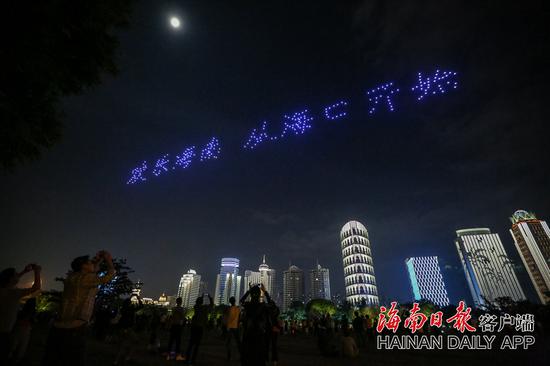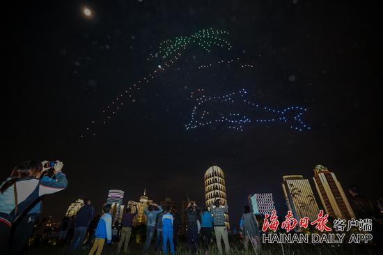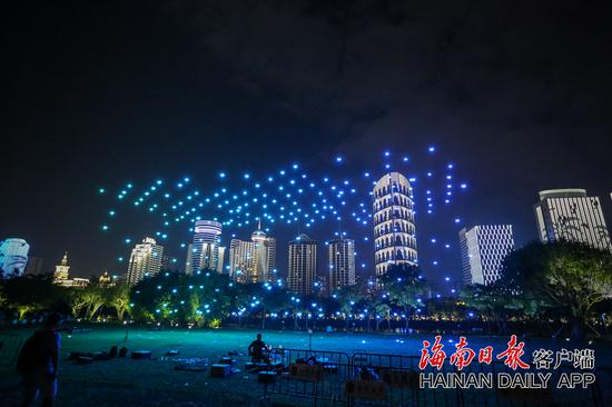 看过来!美!为2018海南欢乐节打造的无人机灯光秀,23日晚亮相海口万绿园!(记者袁琛)