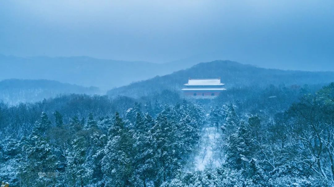 紫金山南麓的山林常年郁郁葱葱,只有在冬季的这段时间被大雪覆盖,和南京市区不同,郊外纷扰的小雪把画面染上了一层朦胧的美。远处的群山被隐去在冬季升腾的雾气中,但是城墙的轮廓依旧清晰可见,通过航拍,你能感受到此刻南京郊外的那份宁静。