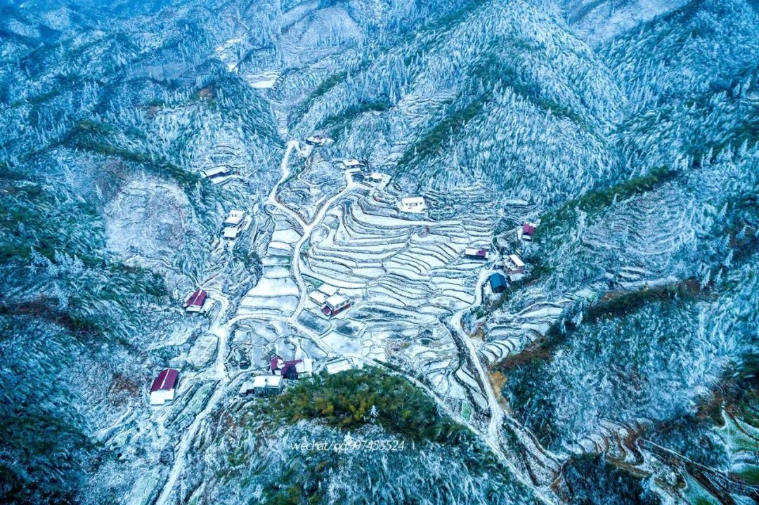 桂林北的资源县隘门界和十里平坦,在一场大雪后原本金黄色的梯田被覆盖成了白色的山野,积雪层叠在山坡上,画面中的红蓝色房顶与零星绿色树冠,是这片宁静村庄仅剩的颜色。在这里你还有机会能航拍到十年一遇的高山雾凇和雪后的云海。建议各位飞友冬季去桂林之前,先查询当地的天气和降雪情况。