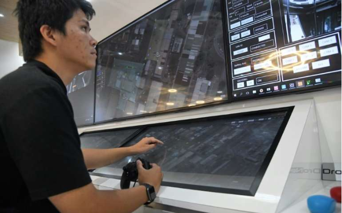 工程师在新加坡指挥中心监控无人机发送的实时视频