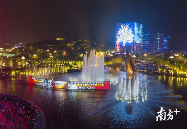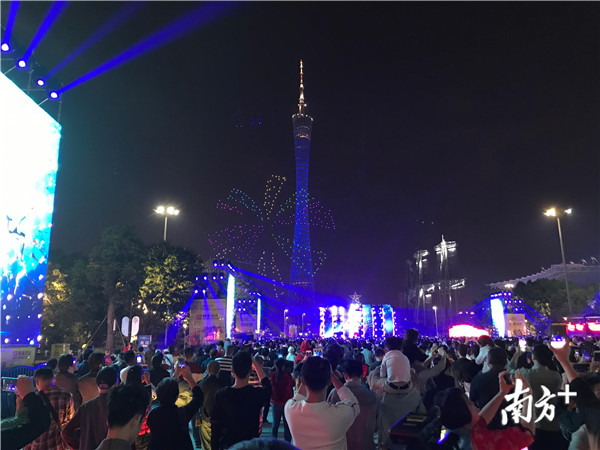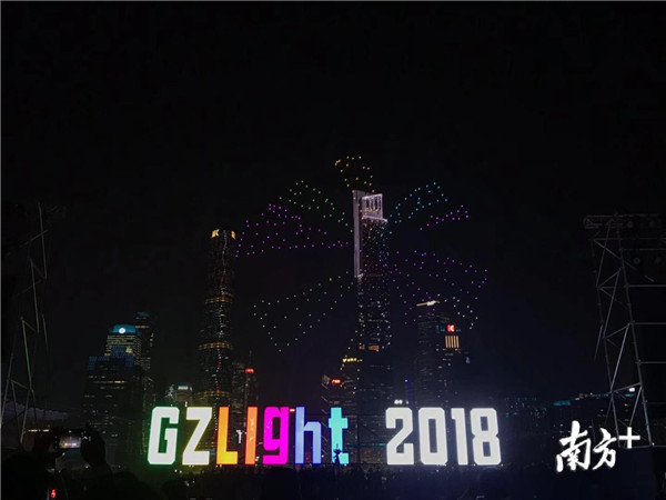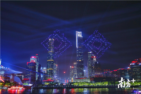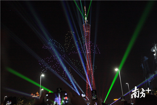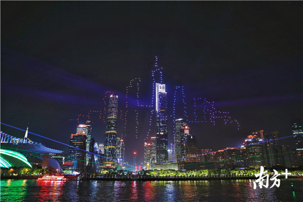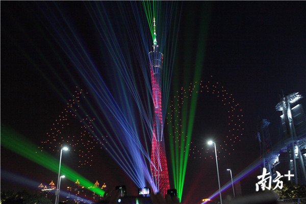 广州塔上斑斓的华彩和300架飞临珠江上空的无人机编队联动演绎。花城广场光影变幻,全球汇集的创意灯光艺术作品,用光媒语言展现广州在改革开放40年历史进程中恢弘激昂的时代故事。