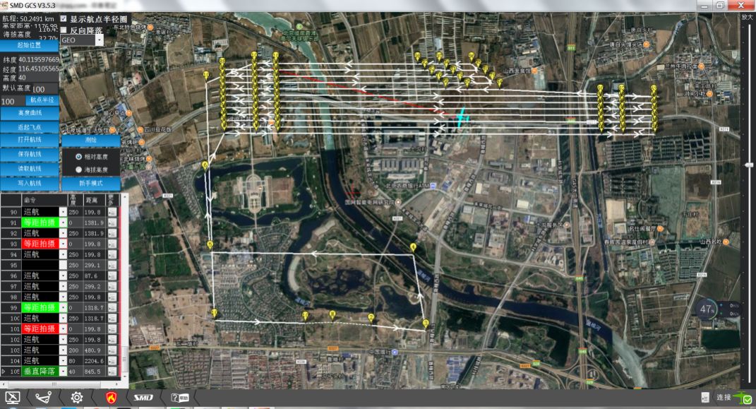 V200采用无遥控,地面站全自动操控,并可使用航线分割工具对较大任务进行分割,本次任务总航程约为300km,出于飞行安全及测区特区特殊性,本次任务将一般任务分割70-80km航程降低为40-50km不等的7个任务,保证无人机返航时保留40%以上电量。