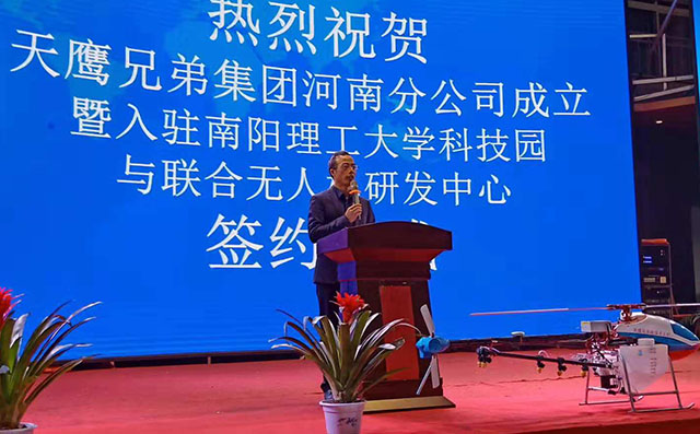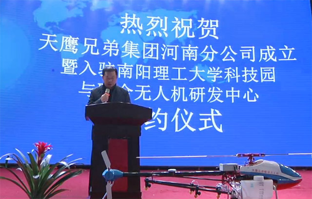 天鹰兄弟创始人李才圣表示为了三农事业的发展,天鹰兄弟与南阳理工学院共同努力,以南阳为根基,服务中原,加大推进农业无人机研发与推广,共同推进科技普惠农业、天鹰产业精准扶贫,支持南阳产业发展。