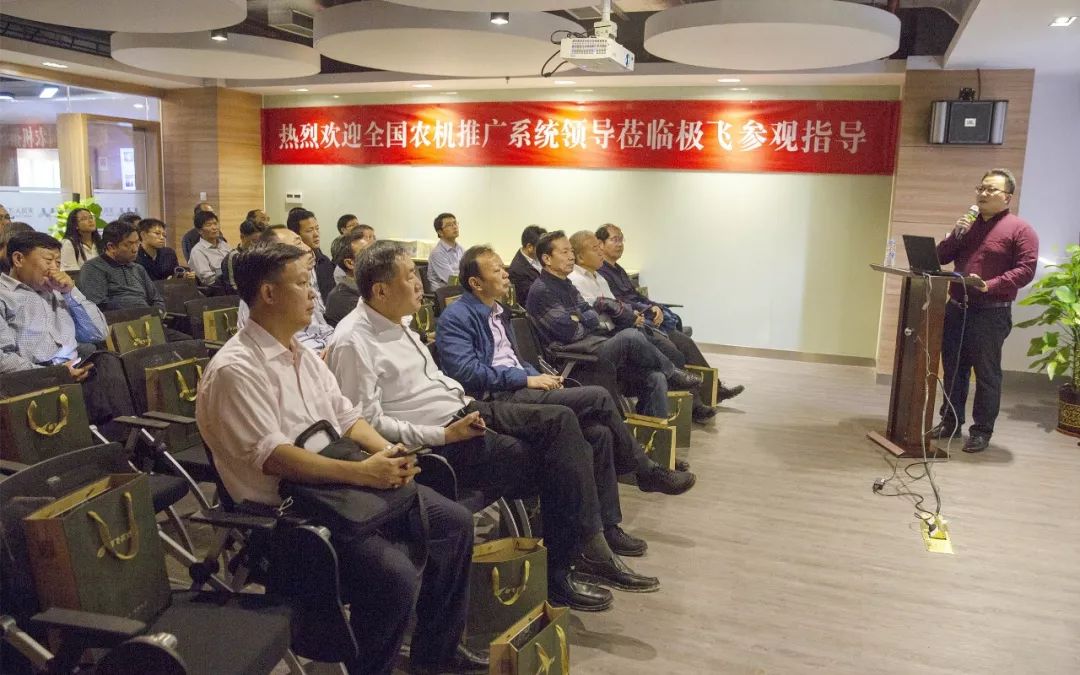 2018 年 11 月 26 日上午,由全国农业农村部农业机械化技术开发推广总站发起的《创新农机化技术推广运行机制与服务模式》研讨会在广州举办,来自农机推广系统领导一行参与了会议,并于当日下午莅临极飞科技进行参观指导。