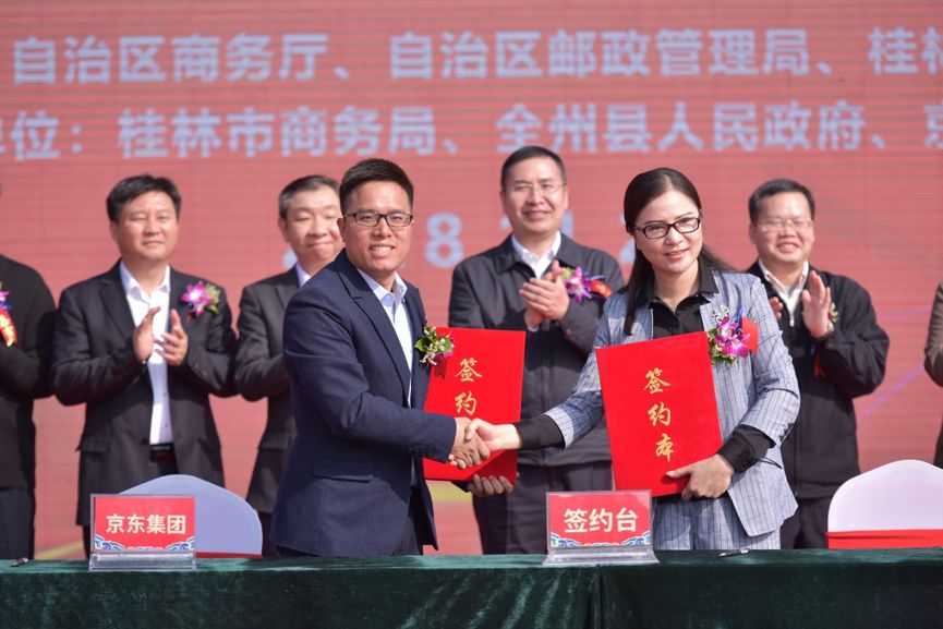 首飞仪式上,全州县政府与京东华南区签订战略合作协议,双方将共同拓展产品上行渠道、打造全州公共品牌、完善电商物流基础、升级零售服务载体与开展电商扶贫培训。