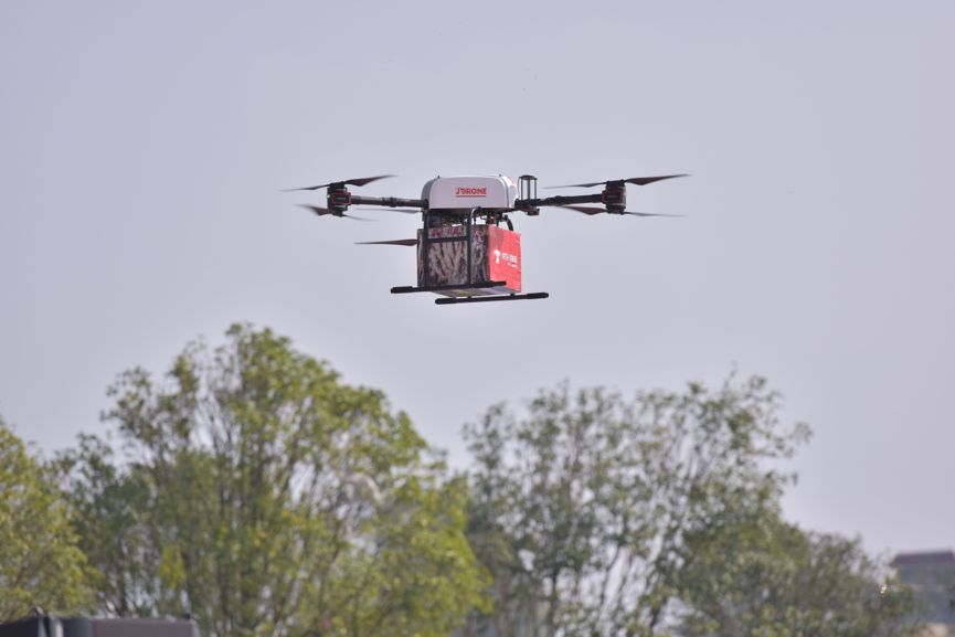 2016年6月8日上午9点,在江苏宿迁市曹集乡同庵村居委会内,一架三轴无人机缓缓起飞,十分钟后,5公里外的旱闸村居委会内,京东当地的推广员接收包裹,无人机送货第一单完成。京东方面称,无人机正式投入农村物流试点运行。