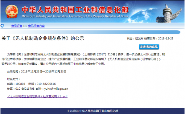 近日,工信部官网文件发布,进一步加强无人机行业管理,规范行业市场秩序,加快培育优势企业,提升产业发展质量,工信部组织编制了《无人机制造企业规范条件(征求意见稿)》,现予以公示以征集意见。