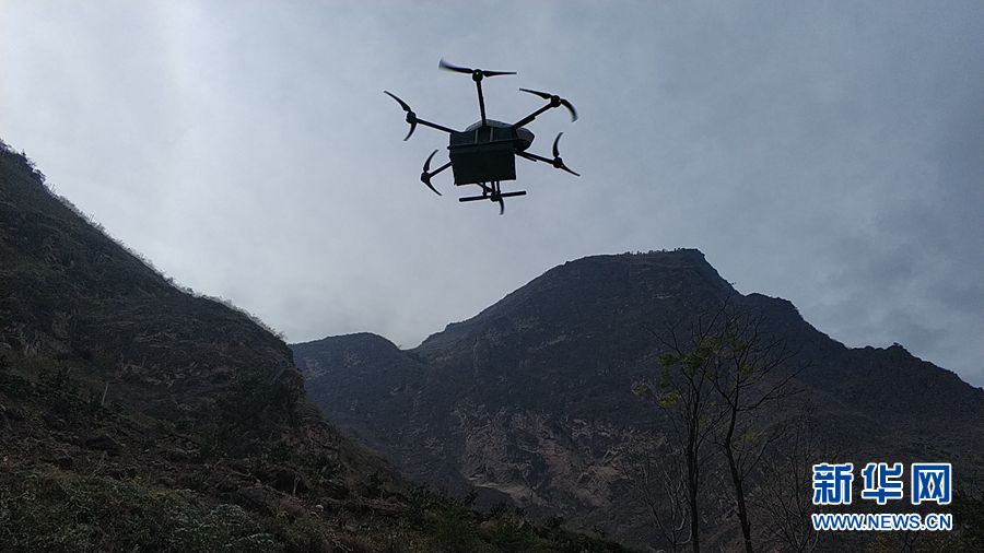 11月29日,四川凉山州邮政分公司工作人员在昭觉县“悬崖村”通过无人机邮路,成功将《人民日报》《四川日报》等党报党刊及信函信件小型包裹送到村民手中。图为邮政无人机在悬崖下的起飞点等待起飞。