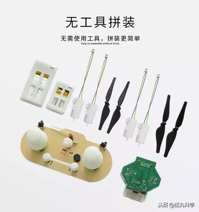 在没有动手之前,你可能觉得让自己拼飞机会有点难,小孩子更加不知道从哪下手了。但是,这恰恰就能体现这款无人机设计的精妙,因为它所有的DIY过程都是无螺丝结构,全程也不需要任何工具辅助,简单到10岁左右的孩子都能轻松搞定。