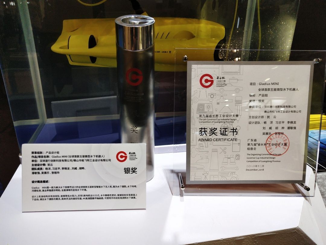 12月1日,广东省第九届“省长杯”工业设计大赛颁奖典礼在广州举行。深圳潜行创新最新研发的潜拍无人机“鲛GLADIUS MINI”凭借出色的设计和性能,从32051件参赛作品中脱颖而出,荣获大赛银奖。