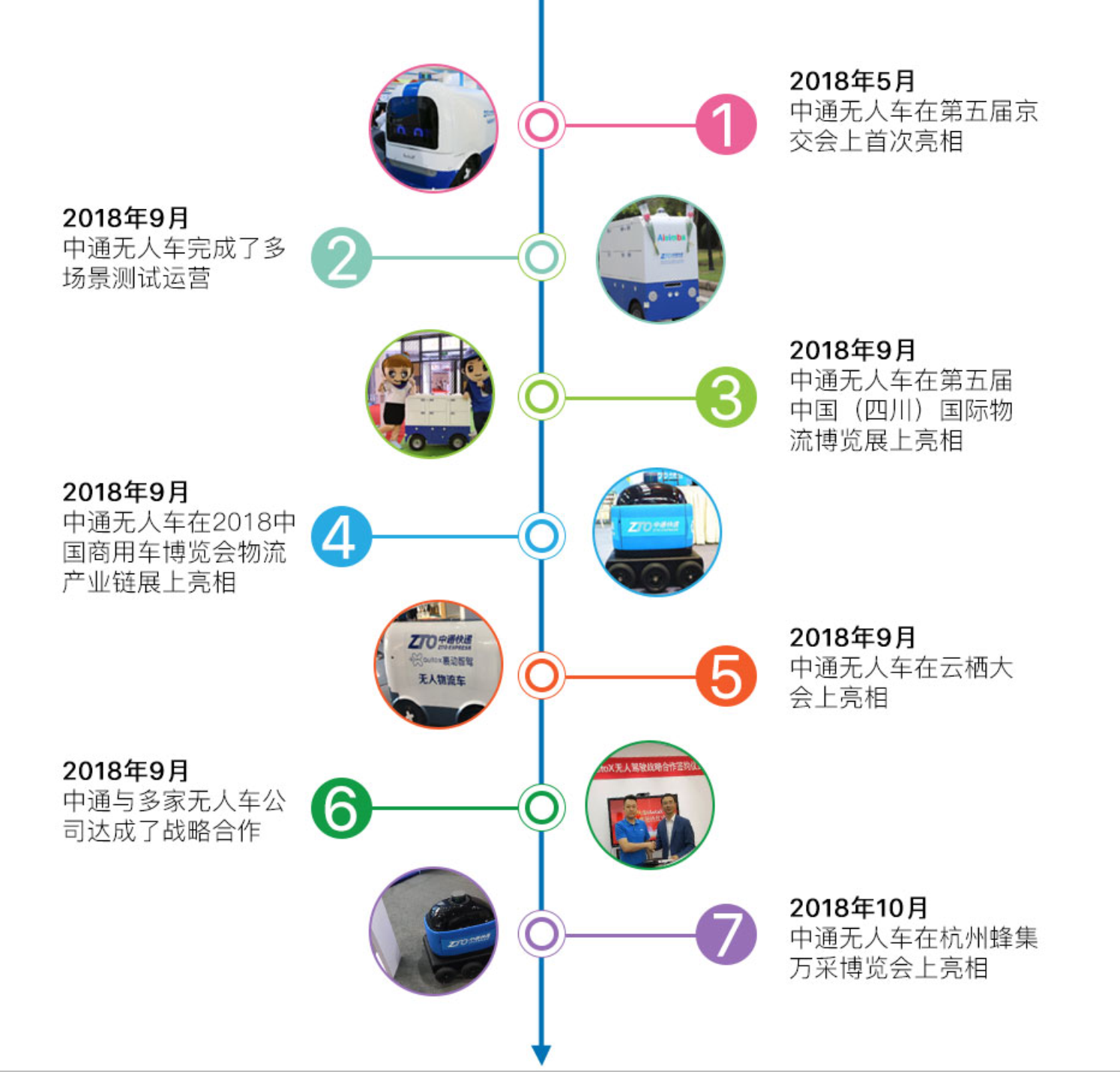 相对而言,末端无人车相比无人货车,配送机器人速度更慢;对安全的要求相对比较低,在技术层面更加容易实现,在这里领域开展测试的物流快递企业更多一点,如图为中通快递无人车应用历程: