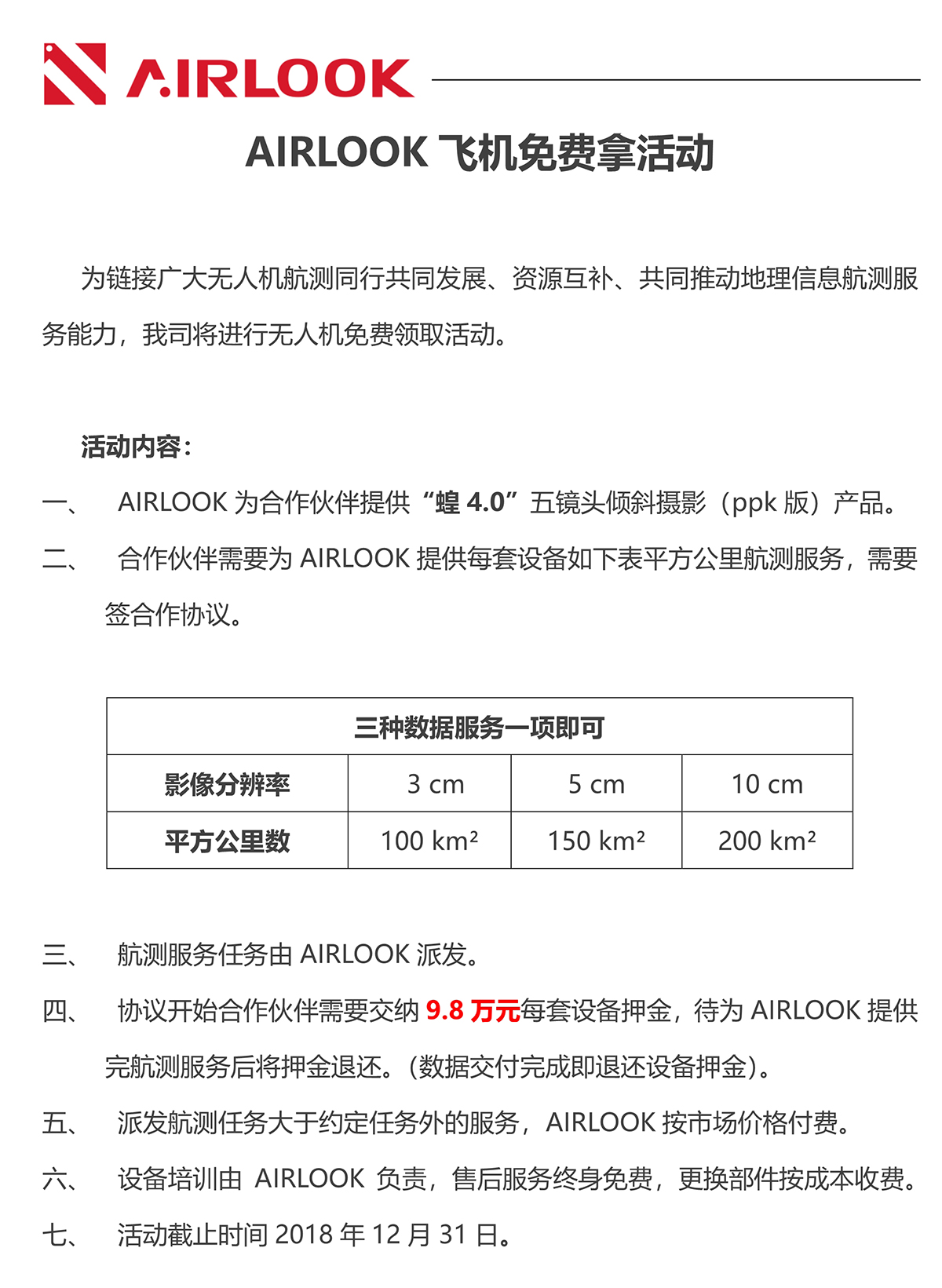 AIRLOOK免费为广大合作伙伴提供“蝗4.0”全套倾斜无人机,并派发航飞任务给合作伙伴,任务完成后无人机归合作伙伴所有。成为“航飞中国”成员后,AIRLOOK后续派发的航飞任务由双方根据项目情况议价。