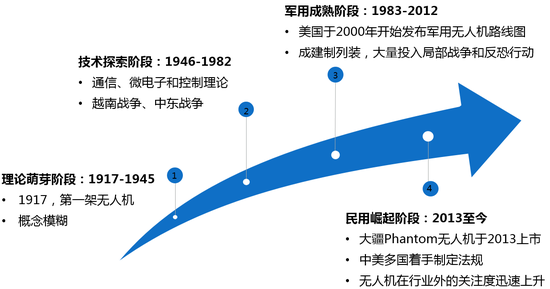 综合无人机的技术、规模、应用和法规等发展情况和标志性事件,将无人机发展历程划分为4个阶段。