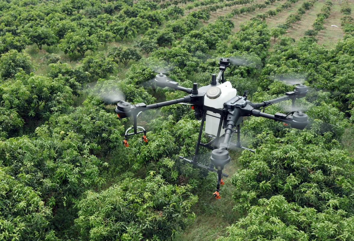 得益于测绘、三维建模以及 AI,果园里各棵果树的位置与高度都能被感知,T16 只对果树进行喷洒,并且能根据果树的高度实时调整飞行高度。