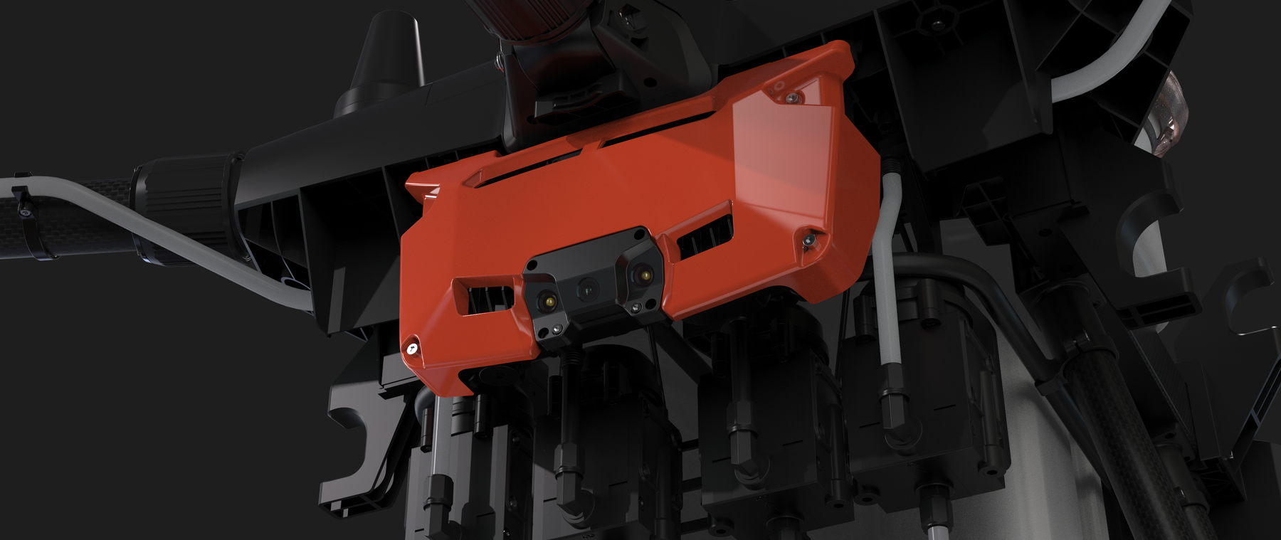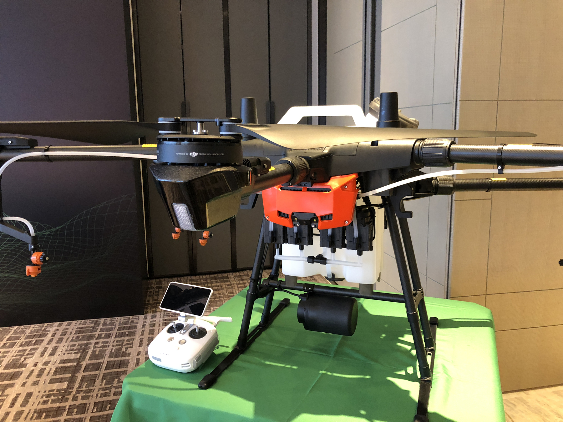无人机正面还有配备一个广角 FPV 摄像头与夜间探照灯,图传距离为 3 千米,可以在飞行时通过遥控器的屏幕监控飞机的作业环境。