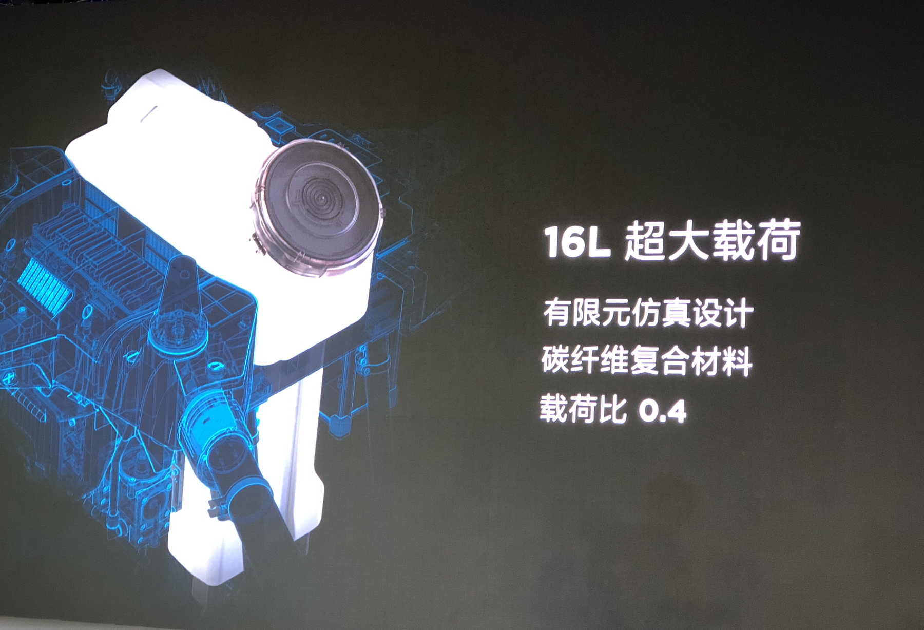 T16 植保无人飞机,最大载荷为 16 升,使用碳纤维复合材料等工艺,保证强度同时大大降低了整机的重量,载荷系数(载荷 / 整机重量比)为 0.4。