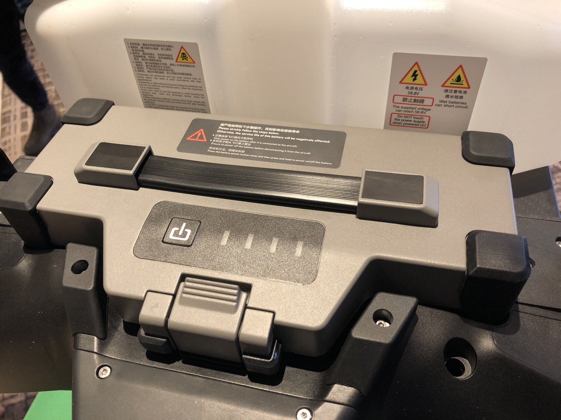 无人机所使用的智能电池,采用优化的电芯配方与散热设计,可达 400 次循环,使用全金属设计,达到 IP54 防护。