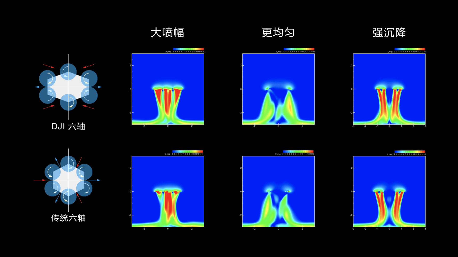 T16 还将风场模拟导入无人机的布局设计中,能够有效优化喷洒中心区内吸和尾部气流上扬的现象。