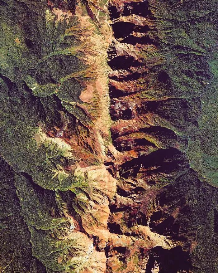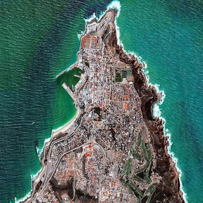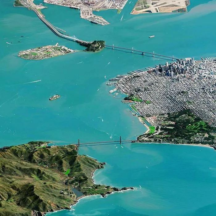 ▼美国加利福尼亚州,旧金山。它是最新卫星“世界观-3”在800英里以外太平洋上空拍摄的。卫星相机的焦距是标准单反相机的32倍,这使得这样的图像成为可能。这个图里依然可以看到我们熟悉的金门大桥,海湾桥,恶魔岛。