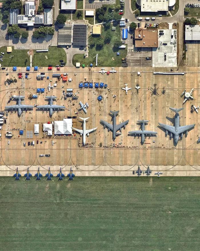 ▼美国密苏里州的航展。从高空看好像是玩具飞机停靠在地上。这次活动包括空中表演和地面展示数十架飞机,包括美国海军蓝天使,C-130大力神运输机,P-51野马,一架F-16毒蛇等。