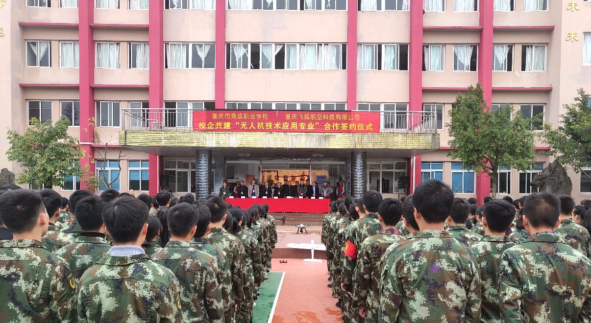 (无人机网西南运营中心讯)12月4日上午十时,两江新区空港新城,雨后山城的天气格外清新,重庆竟成职业技术学校操场内,庄严的国歌声中五星红旗冉冉升起,30名空乘专业女学生整齐列队英姿飒爽,1200多名学生手语舞《感恩的心》,在校领导和飞狐航空同仁们共同见证下,重庆飞狐航空科技有限公司与重庆竟成职业技术学校在这里举行隆重的校企合作签约仪式。