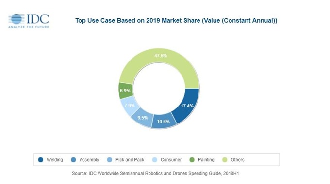 2017年至2022年预测机器人支出增长最快的行业是批发(复合年增长率为31.4%)、零售业(复合年增长率为29.6%)和建筑业(复合年增长率为28.1%)。到2022年,IDC预计零售业将超过消费者领域对机器人系统的支出。