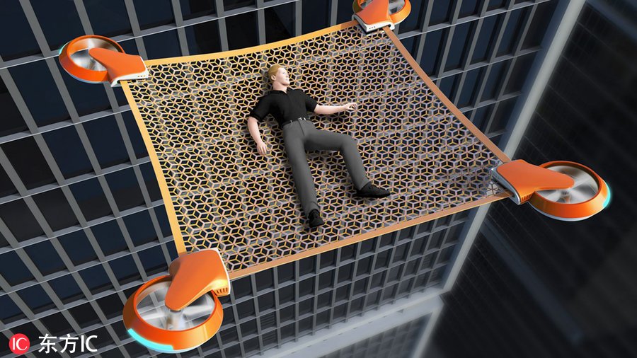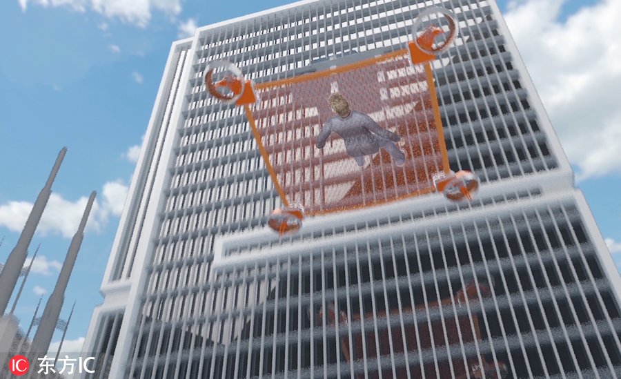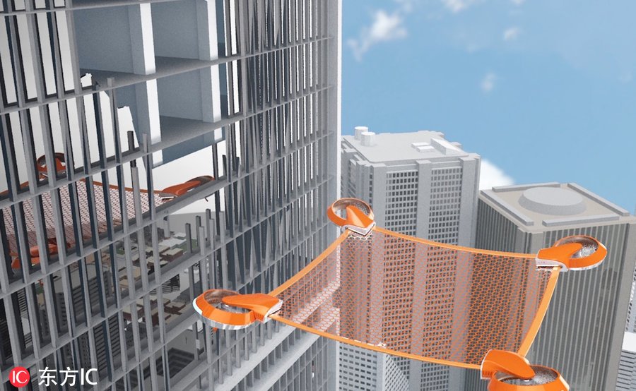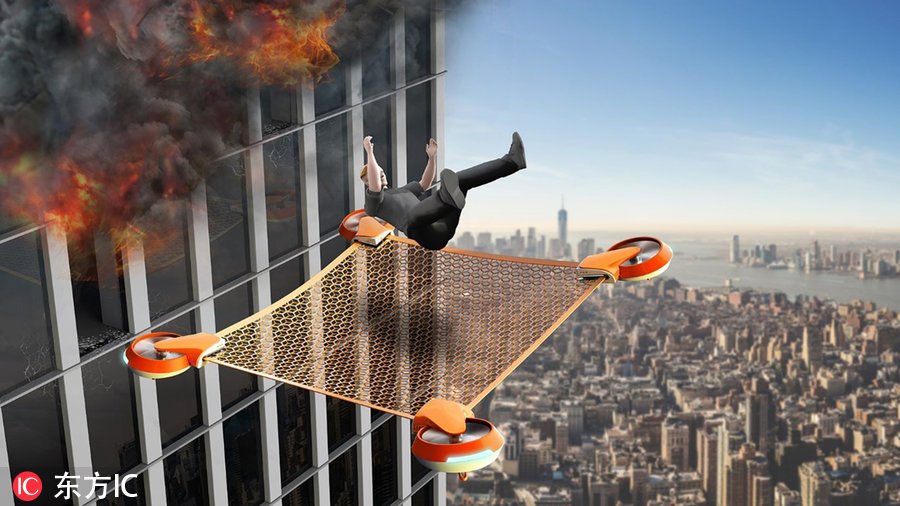 在足够接近起火高楼后,这个无人机将自动拆分成中间是一张大网的四个支撑部件,接住跳下的受困者。