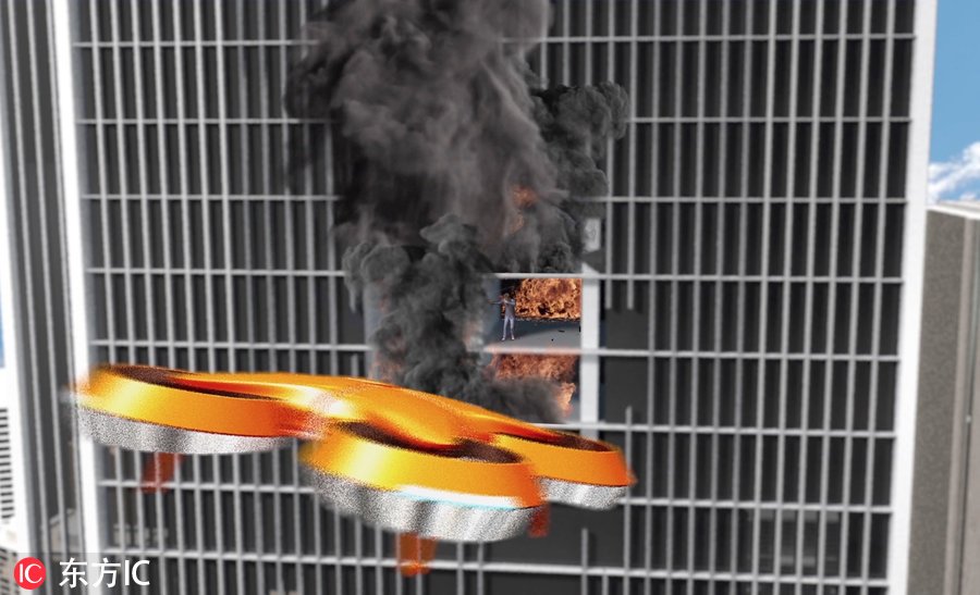 设计显示利用无人机来营救被困在起火高楼中的人员。