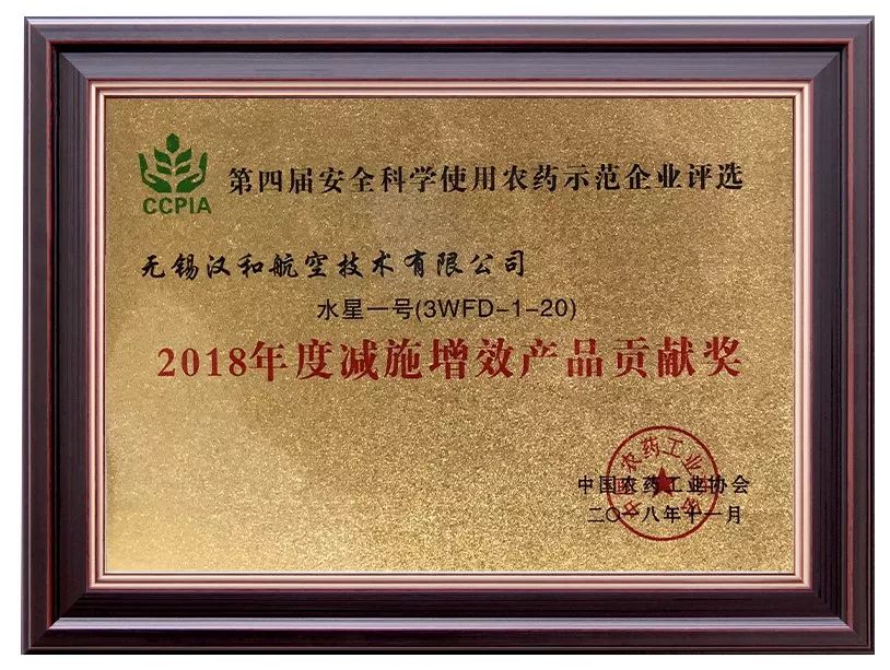 前不久,第五届农药安全科学使用高峰论坛在四川成都完美落幕。在大会同期举办的“第四届安全科学使用农药示范企业评选颁奖典礼”中,汉和航空的明星产品——水星一号荣获“2018年度减施增效产品贡献奖”。
