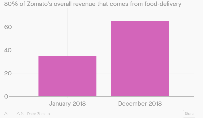 十年前,Zomato由Goyal和Pankaj Chaddah建立,最初是一个搜索平台,后来添加了其他板块,如支付功能,外卖,餐桌预订,B2B食品配料供应等。而其食品配送业务增幅较大,目前占总收入的65%,1月份的时候该业务的占比还是35%。