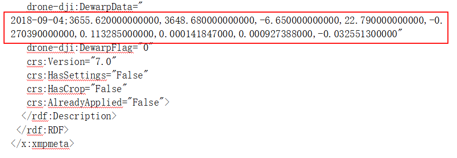 大疆精灵4RTK均已经做过出厂畸变校正,在照片内部已经记录了相应的检校后相机参数,下例所示为赛尔无人机自动精灵4RTK测试机参数,分析可以看出相机畸变特别小。