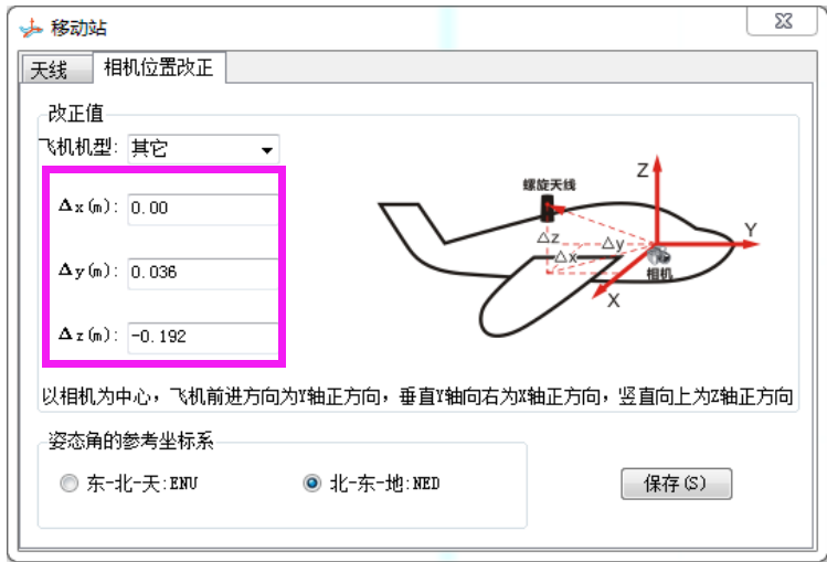 大疆精灵4RTK自带实时差分,但是有很多客户可能使用第三方基站进行后差分POS解算,飞机相位中心到相机CMOS的位置补偿机头方向为36mm,高度方向为192mm,和机头方向垂直为0,如下图所示:
