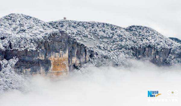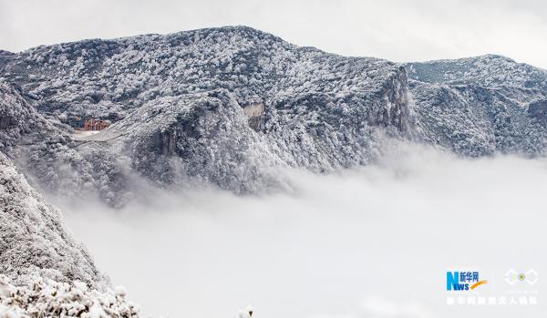 随着气温骤降,一场大雪在重庆南川金佛山飘落,给游客带来一幅如墨似画的大美雪景图。据悉,金佛山是典型的喀斯特桌山地貌,每年的冰雪期长达4个月,有“南国雪原”之称。图为无人机航拍金佛山穿云而上的索道。新华网发(汪新 凌云霄 摄)