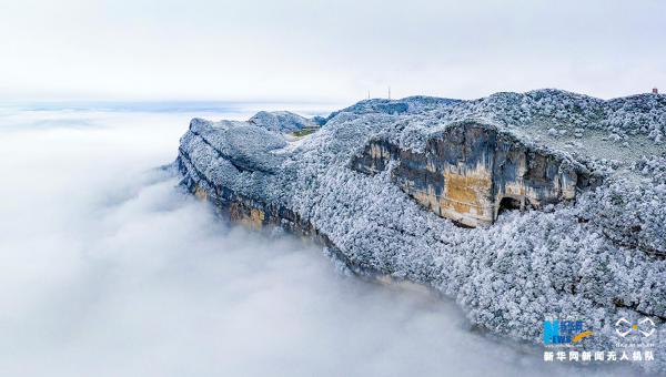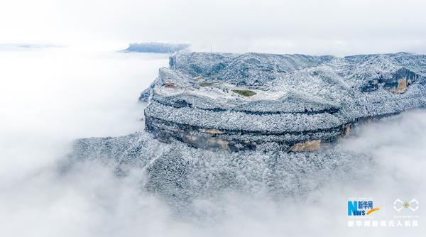 随着气温骤降,一场大雪在重庆南川金佛山飘落,给游客带来一幅如墨似画的大美雪景图。据悉,金佛山是典型的喀斯特桌山地貌,每年的冰雪期长达4个月,有“南国雪原”之称。图为无人机航拍金佛山北坡雪景,被大雪覆盖的桌山高居雪海,视野震撼。新华网发(汪新 凌云霄 摄)