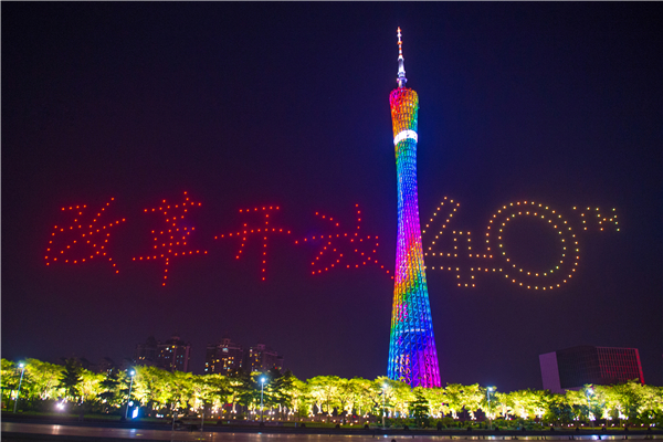 国庆节之夜,以“壮阔东方潮,我爱你中国”为主题的致敬改革开放40年国庆灯光表演主题活动在广州珠江两岸上演。10月1日晚,广州海心沙上空,300架无人机编队组成“改革开放40周年”字样祝福祖国,为市民游客献上一场视觉盛宴。