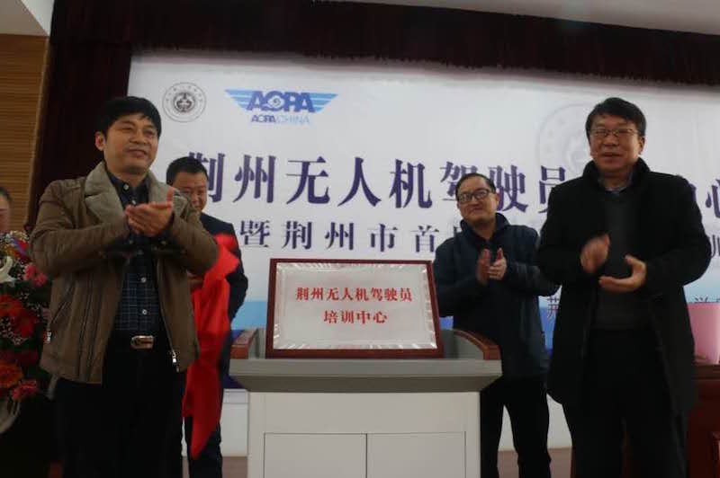 活动高潮,校党委书记、校长别业舫教授、湖北省无人机产教联盟理事长陈方晔教授、荆州市高新技术开发区曾德才主任、西航(荆州)无人机科技有限公司周太钧总经理一起为荆州无人机驾驶员培训中心揭牌。