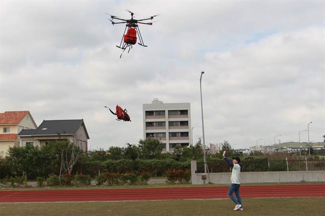 工研院将无人机结合救灾工作,可抛投救生衣给受困民眾。(何冠娴摄)