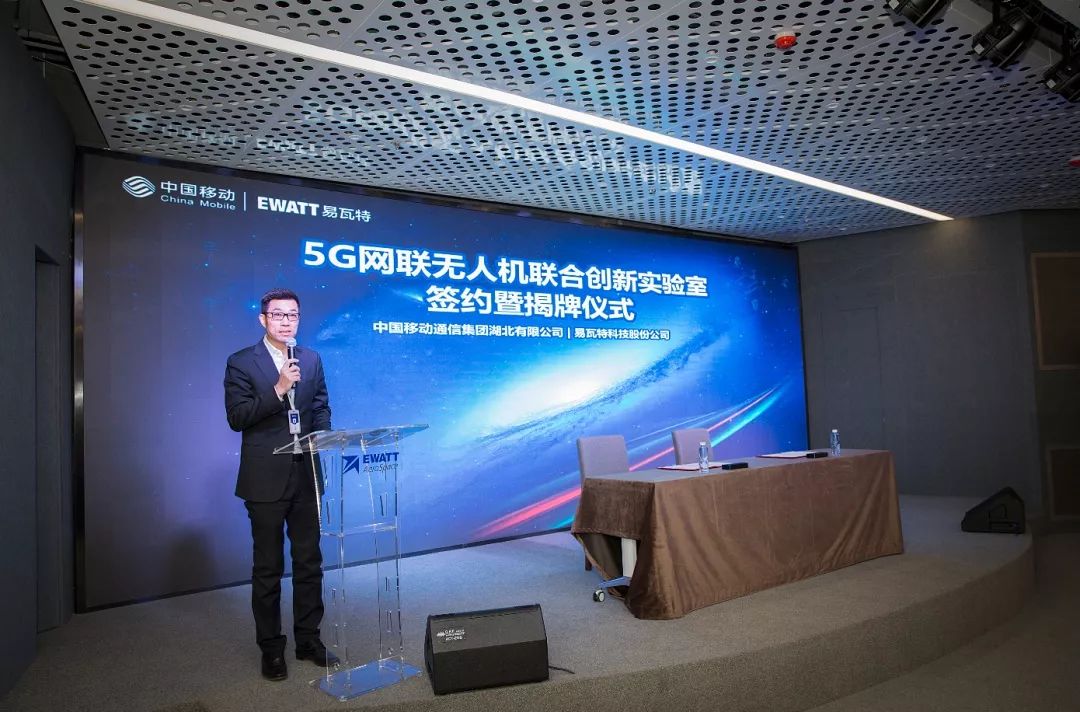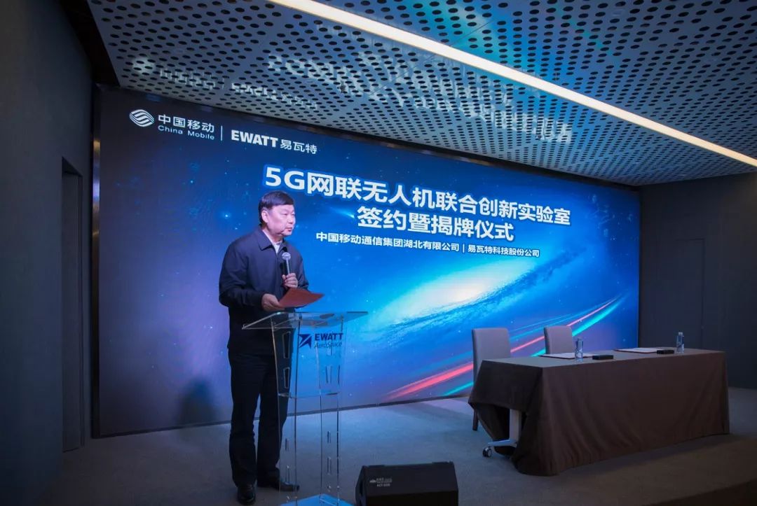 12月14日上午,华中首家基于5G网联无人机联合创新实验室在易瓦特挂牌,揭牌仪式在易瓦特无人机科技园举行。中国移动通信集团湖北有限公司董事长、总经理范秉衡、易瓦特科技股份公司董事长赵国成发表了讲话并共同揭牌。