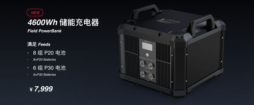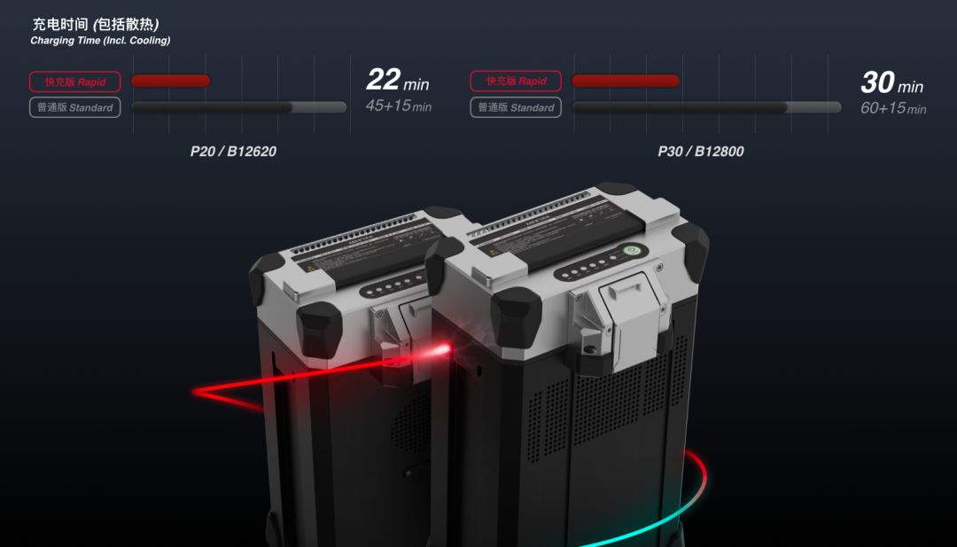 全新储能快速充电器,内置4600wh电量,可充满8 组P20 电池,满足飞手在转场、运输期间同时充电的需求,大幅提升整体作业效率。