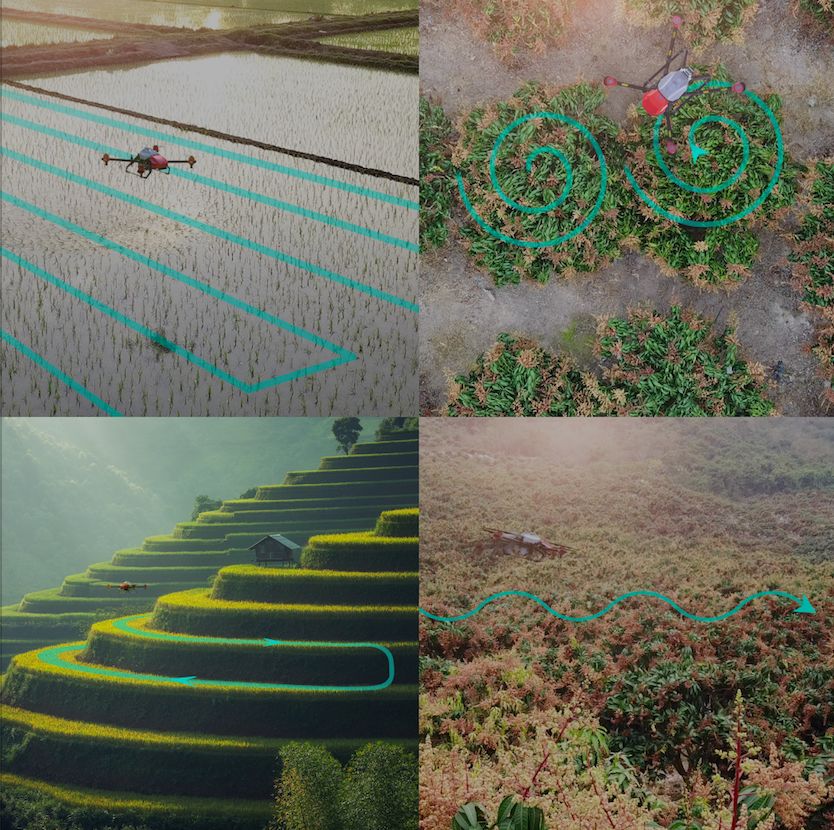 配备极飞第五代全自主作业模式及仿地雷达模块,只需在 App 上预设基本的飞行及喷洒参数,便可在平原、丘陵、树林等不同场景自如作业。支持弓字航线、螺旋航线、自由航线、波浪航线。