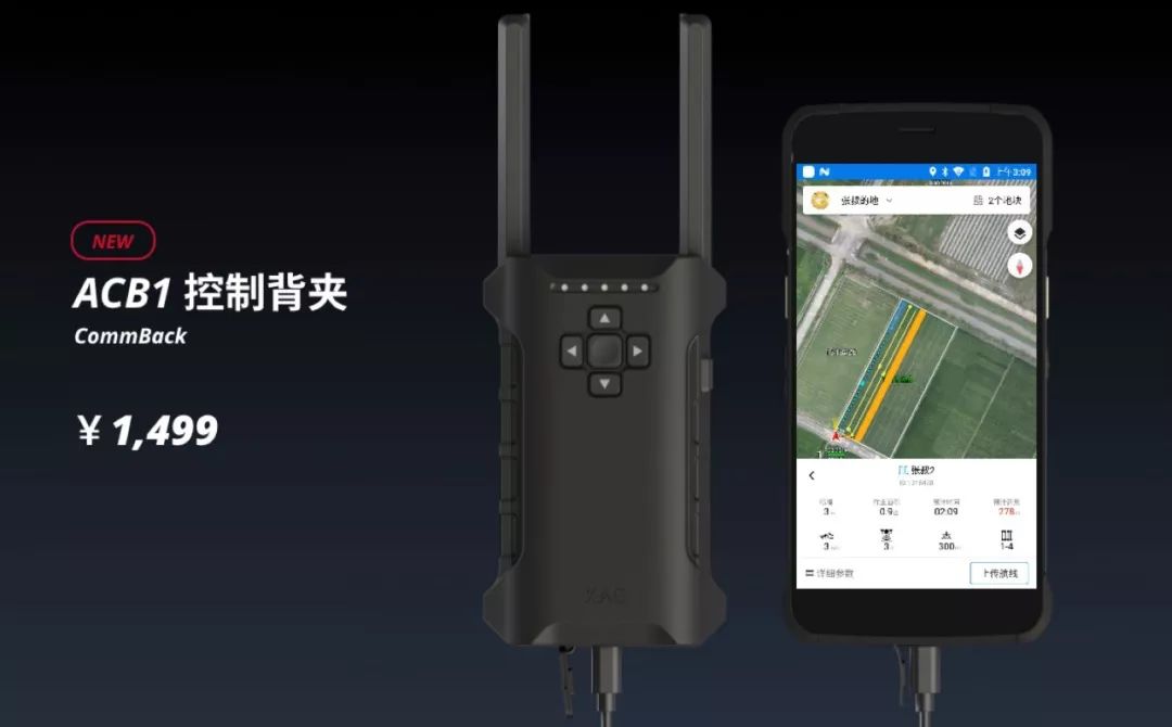 1.创新的 ACB1 无人机控制背夹,支持通过智能手机接入,操控者可在 App 上执行全自主植保作业。使用一键召回功能,可让飞机降停于距离操控者 20 米处的地点,极大提升转场的便利性。背夹还可作为对讲机使用,保证协同作业的高效沟通。此外,熟练的操控者也可选择ARC1 Pro 智能遥控器,使用网格喷洒记忆、定高定速飞行、半自动 AB 点模式等功能。