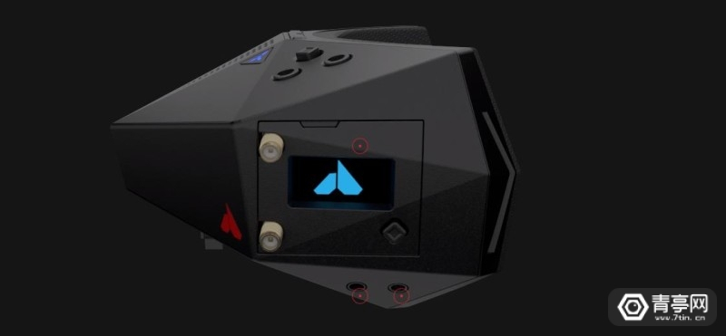 从上图来看,FPV.One头显造型硬朗,外观棱角分明,图中上半部分共拥有2个5向操控杆、电池检查按钮、视频录制按钮(左侧红色)、上下调整按钮、风扇按钮(蓝色灯)、电源按钮(红色灯)。