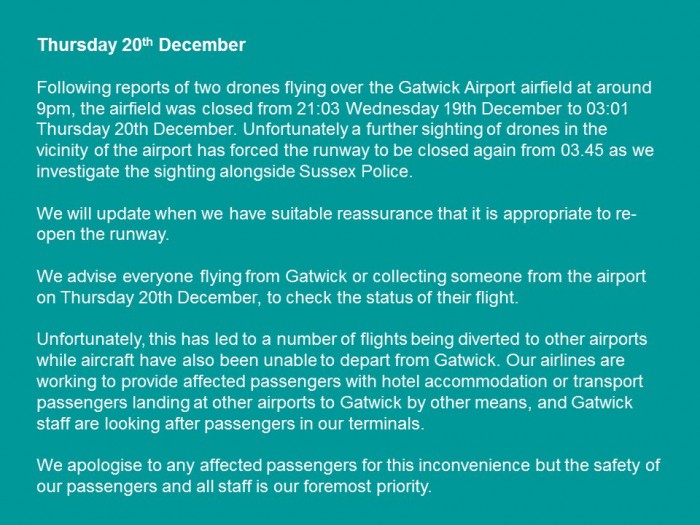 除了防止任何航班起飞外,暂停意味着必须将许多入境航班转移到伦敦地区的其他机场,包括卢顿,希思罗机场和斯坦斯特德机场,而其他航班则被迫降落在巴黎和阿姆斯特丹。总共有760个航班和11万名乘客受到影响,这些航班将于周四从盖特威克机场起飞或降落。