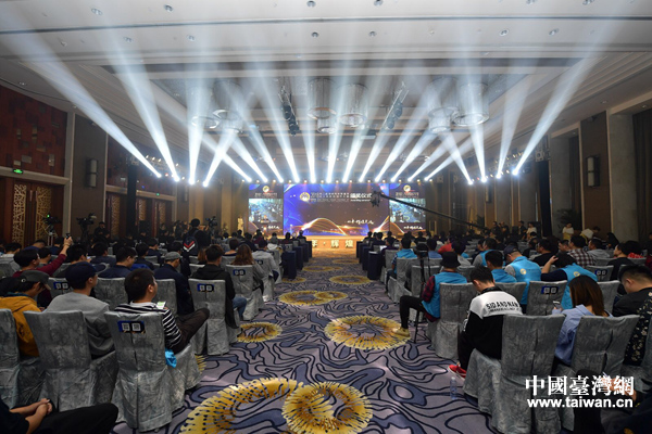 国务院台湾事务办公室新闻局局长、新闻发言人马晓光,中央电视台原春节联欢晚会、综艺大观总导演刘铁民为荣获银奖的台湾团队萌门兔颁奖。(中国台湾网 赵苗青 摄)