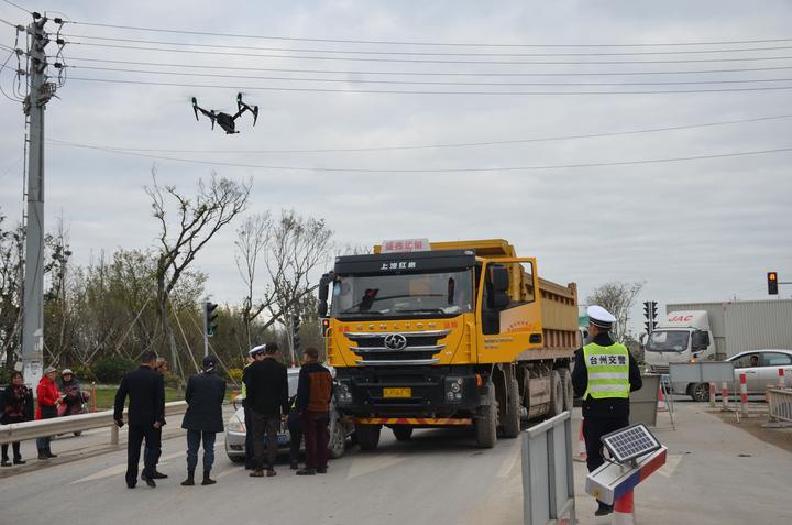 “前方路口有工程车违反禁令标志,正向我卡点驶来,各人员注意拦截。”12月26日上午,台州湾循环经济产业集聚区东方大道上,交警正利用无人机设备,在路面查处交通违法行为。