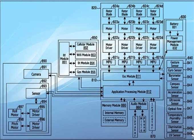 该专利还包括可以使用诸如智能电话之类的IT设备操作无人机的接口技术。该设备具有一些通用的技术,包括通过智能手机、平板电脑或PC进行无线控制的能力——基本上,可以通过任何“电子设备”连接。三星称,它甚至可以是家用电器——如洗衣机,可穿戴设备——甚至是“身体安装型”或“生物植入型”的,例如植入皮下的芯片。