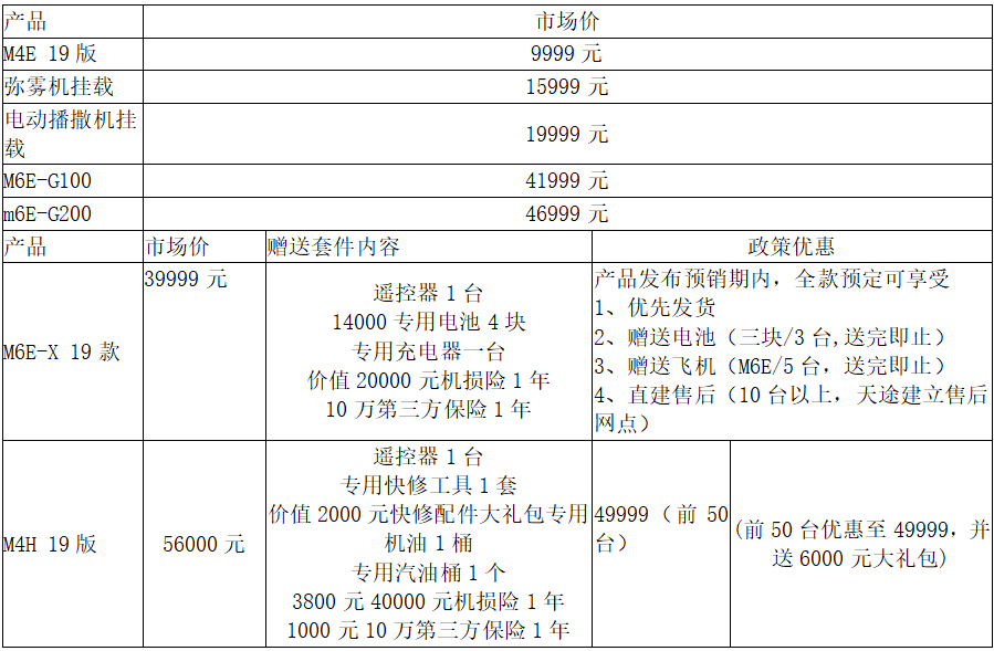 售后服务方面,2019年天途将提供7*24小时服务,包括操作使用智能问答、故障问题远程协助和无人机配件物流查询等。同时用户还可在天途商城购买无人机配件、种子以及选购农药。天途还特别针对M4H油电混合的四旋翼植保无人机推出无忧服务,包括质保期发电机免费保养、双发电机托管服务、免费使用操作培训,购买即送快修礼包、4万元机损险和10万元三者险,以及就近服务点终身售后。