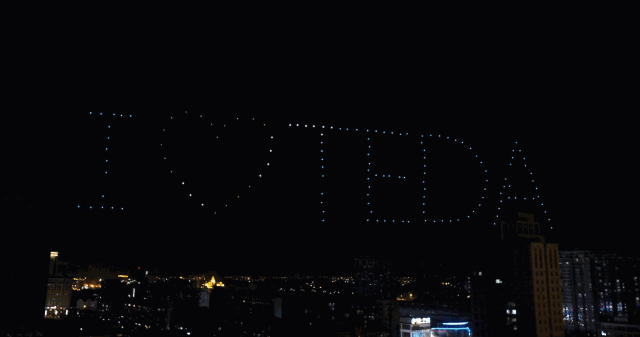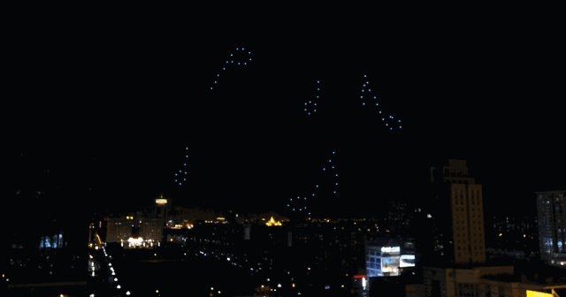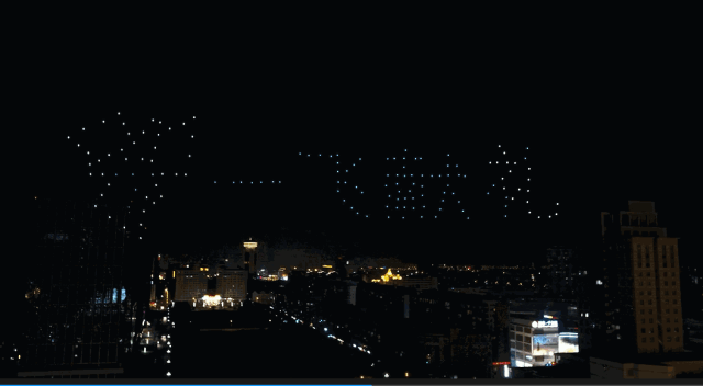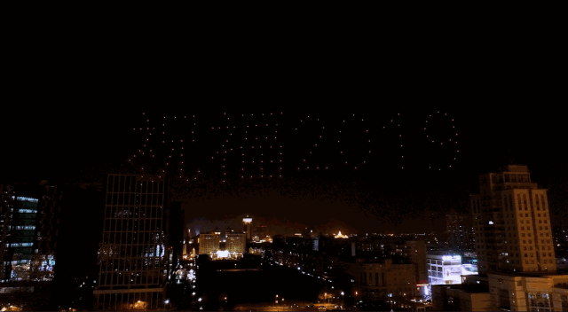 无人机在高楼流光溢彩的衬托下缓缓变幻